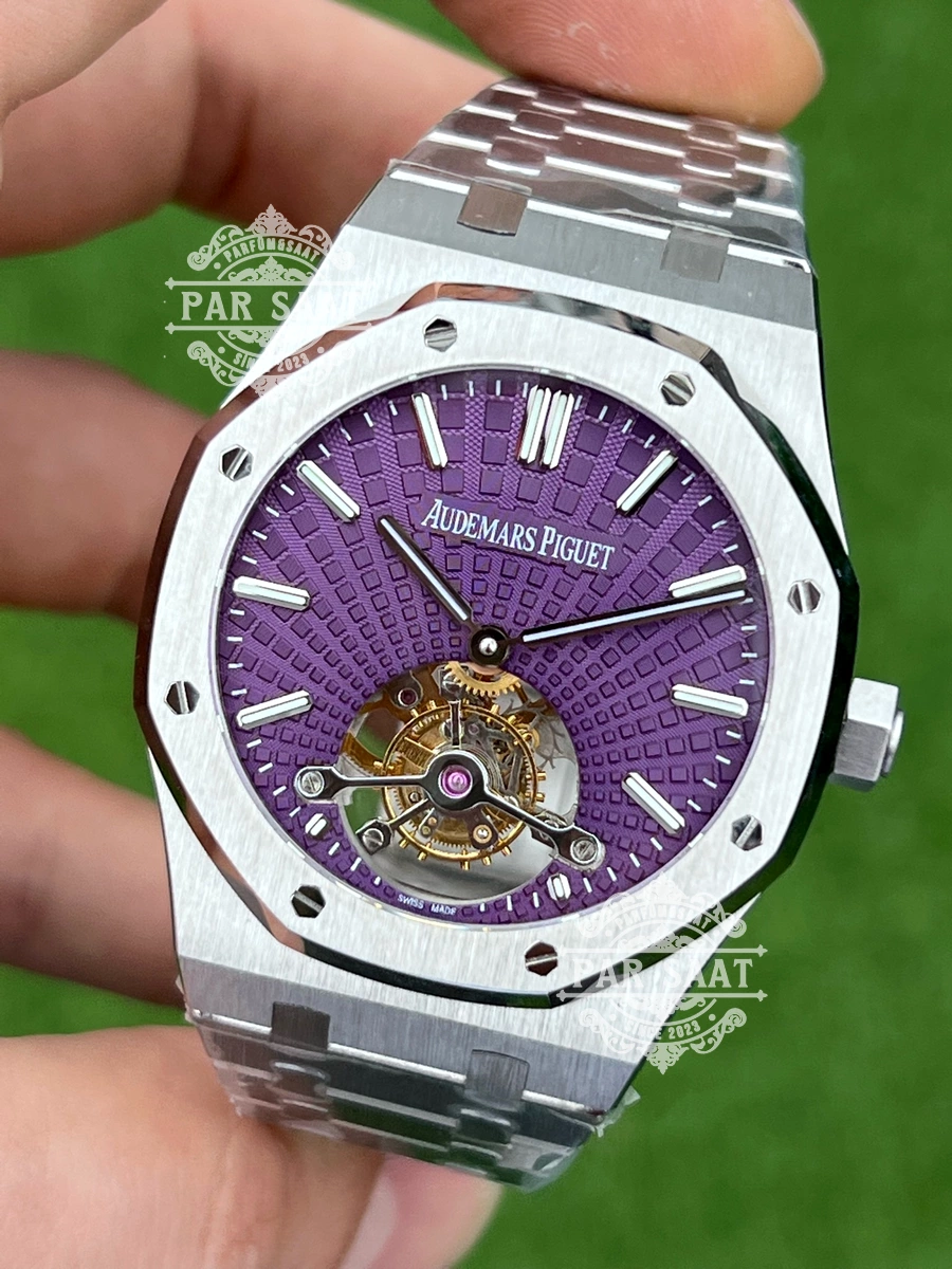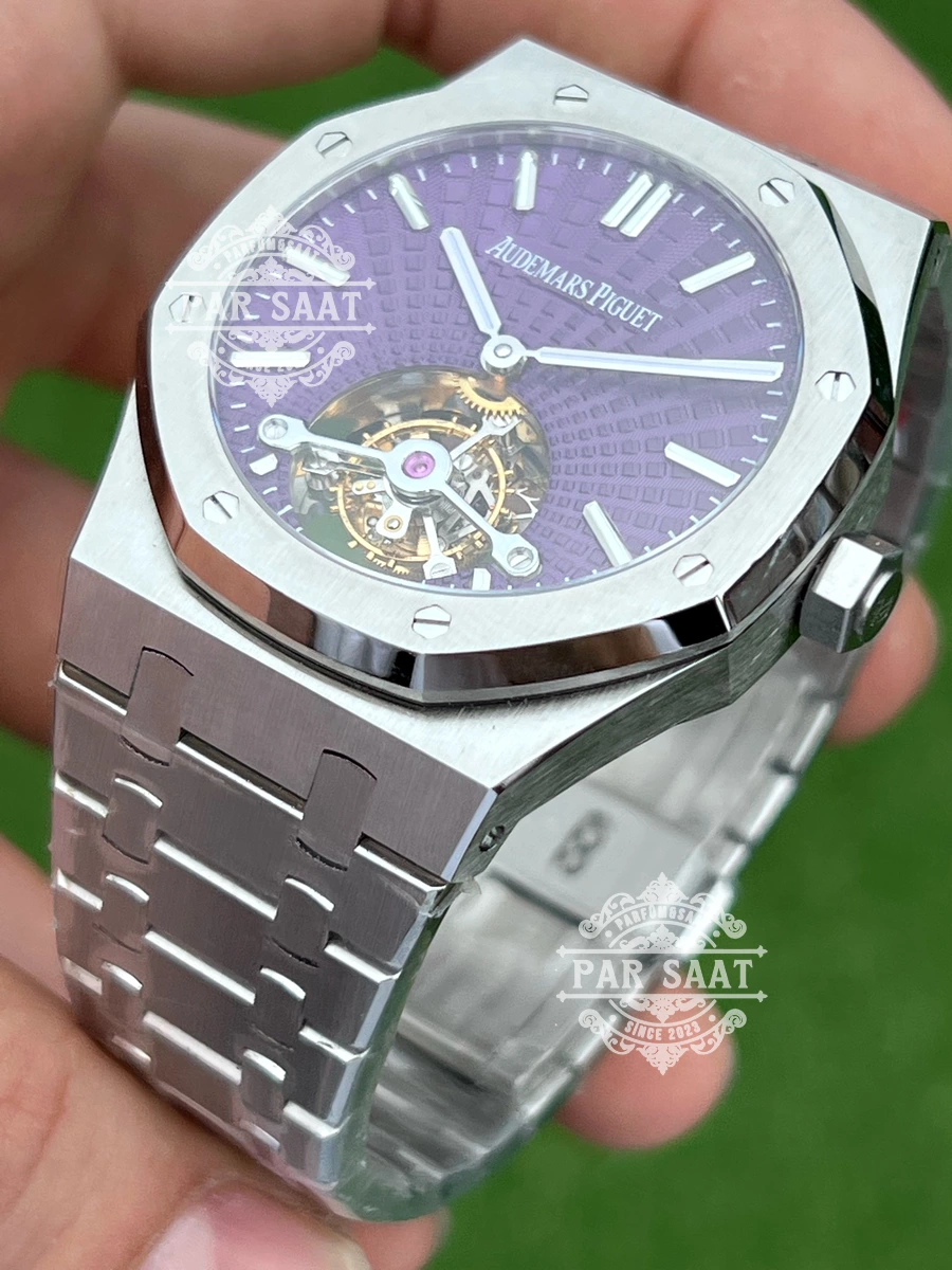 Lüks saatçiliğin zirvesindeki bu eşsiz parça, ikonik Royal Oak tasarımını, nadir mor kadranı ve süzülür gibi duran uçan turbolyonu ile bir araya getiriyor. Bir koleksiyonerin hayalini süsleyen bu saat, en ince detaylarına kadar olağanüstü bir işçilikle üretilmiştir.
