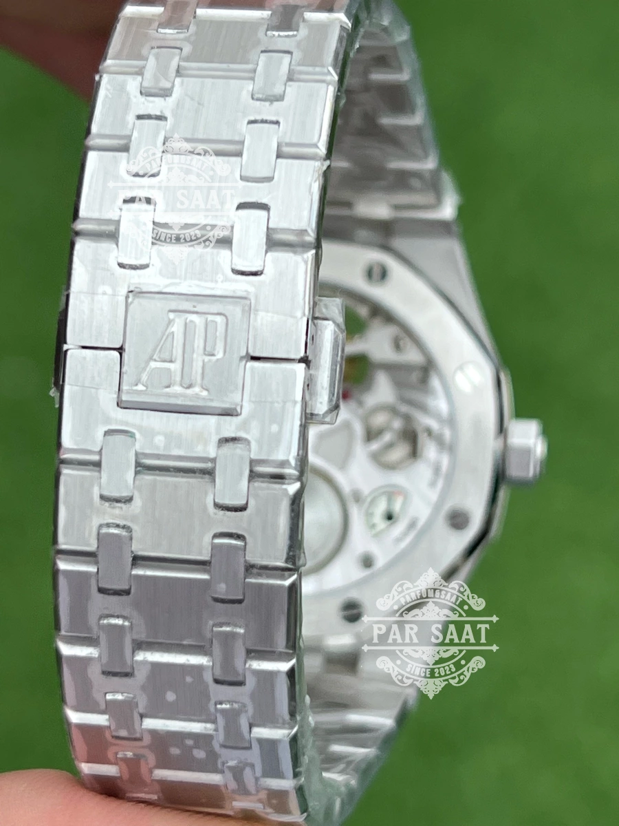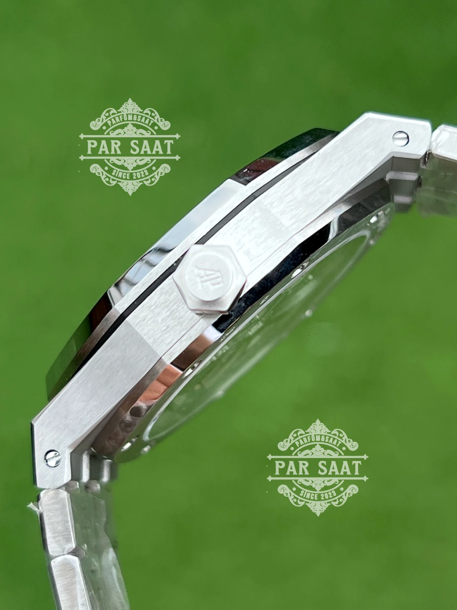 İkonik 41 mm Çelik Kasa: Royal Oak’un efsanevi sekgen bezele ve “tapisserie” desenine sahip çelik kasa, mükemmel parlatma ve fırçalama işçiliği ile işlenmiştir.