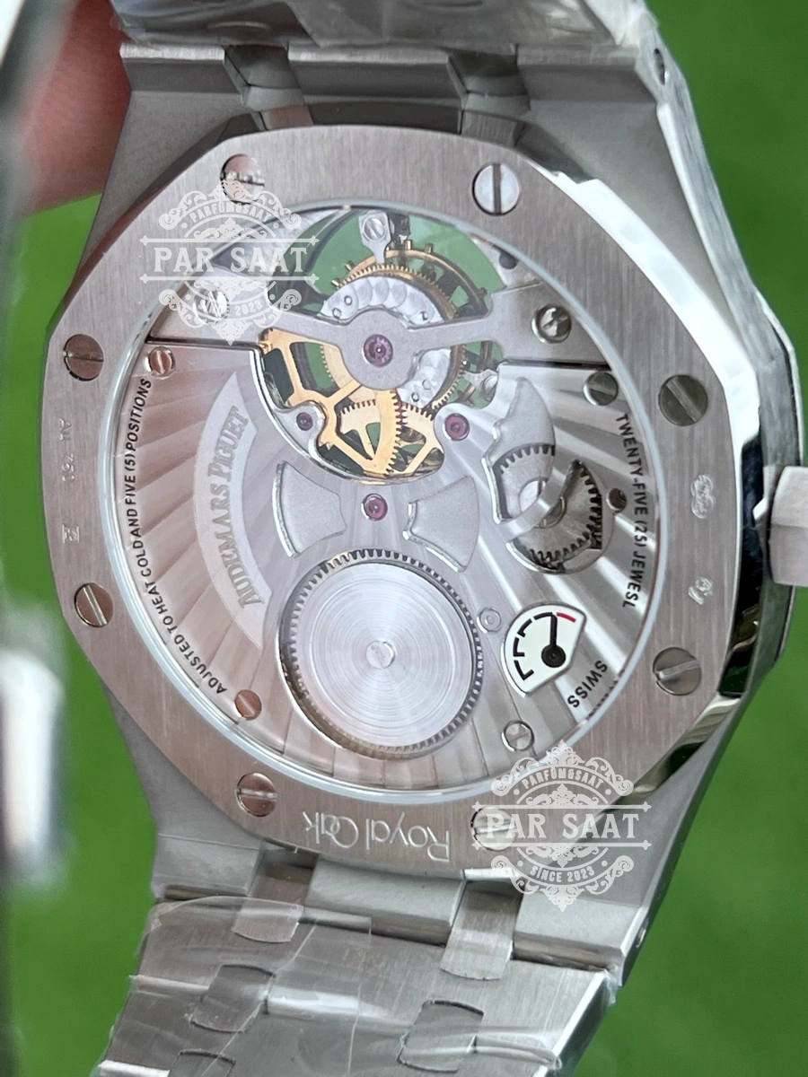 Olağanüstü İşçilik: Şeffaf sapa arka kapak, AP’nin üstün zanaatkarlığını sergileyen manuel kurmalı kalibrenin tüm detaylarını gözler önüne serer.
